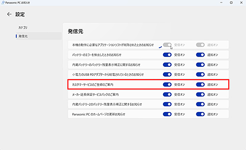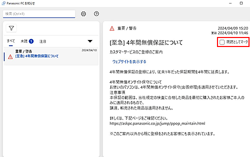 | 26 | 4年間無償保証に登録後も、「4年間無償保証について」が表示されます。 | 既読としてマークにチェックを入れる。![]() 表示を止める方法: 歯車マークから設定画面を開き、"発行元" の画面に移動して、”カスタマーサービスのご登録のご案内” の受信を オフにするとこの機能のお知らせが更新されなくなります。 ![]() |